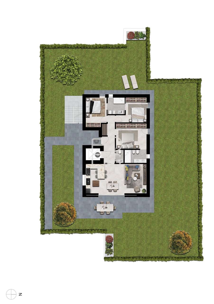 Innerhalb der Anlage bieten wir eine Erdgeschosswohnung, frei auf allen vier Seiten, mit großzügigen nutzbaren Außenflächen, bestehend aus einer überdachten Loggia und einem großen angrenzenden Privatgarten.