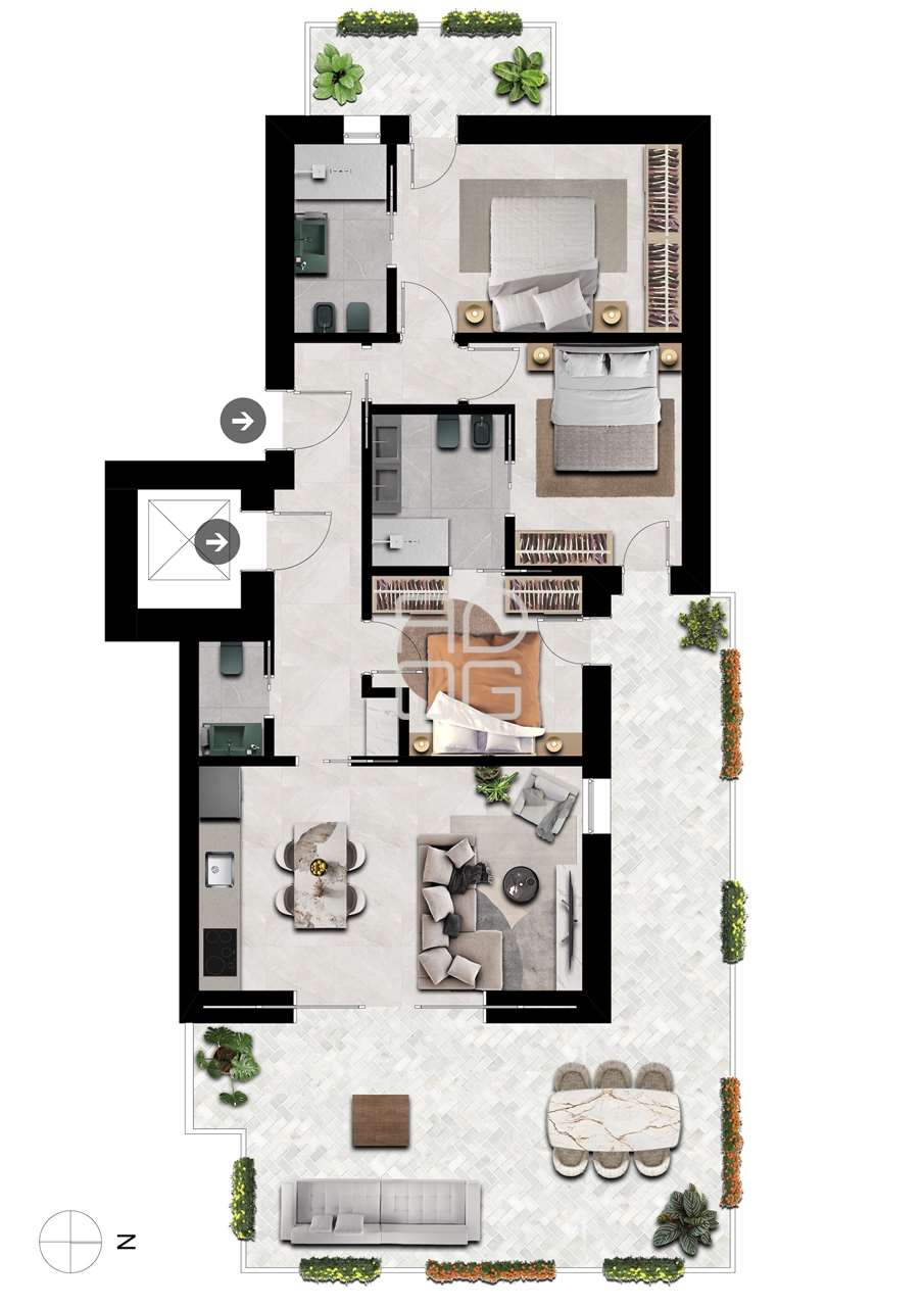 Die Wohnung umfasst einen geräumigen Wohnbereich mit offener Küche und direktem Zugang zur privaten Terrasse, einen Flur zur Schlafzone mit direktem Aufzugzugang, ein Gäste-WC für den Wohnbereich sowie drei Schlafzimmer, davon das Hauptschlafzimmer mit eigenem Bad und Balkon, während sich die beiden weiteren Schlafzimmer ein Bad teilen. Alle Räume verfügen über große Fensterflächen, die für hervorragende Helligkeit sorgen und im Wohnbereich einen fließenden Übergang zwischen Innen- und Außenbereich ermöglichen.