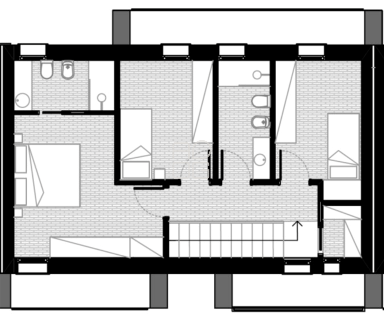 Das mittlere Haus, frei auf zwei Seiten, erstreckt sich über zwei Etagen und verfügt über einen eigenen Eingang sowie eine Garage mit direktem Zugang zum Wohnbereich. Im Erdgeschoss befindet sich ein großzügiger Wohnraum mit offener Küche und großen Fensterfronten, die auf den privaten Garten blicken, sowie ein Gäste-WC. Im Obergeschoss befindet sich der Schlafbereich mit einem Hauptschlafzimmer mit eigenem Bad, zwei Einzelzimmern, einem weiteren Bad und einem praktischen Abstellraum, der auch als Waschküche genutzt werden kann. Alle Räume verfügen über drei Balkone.