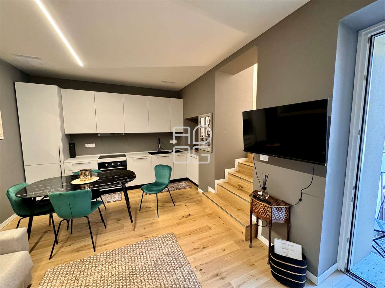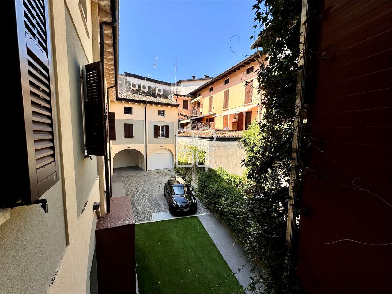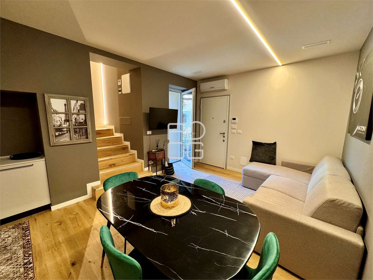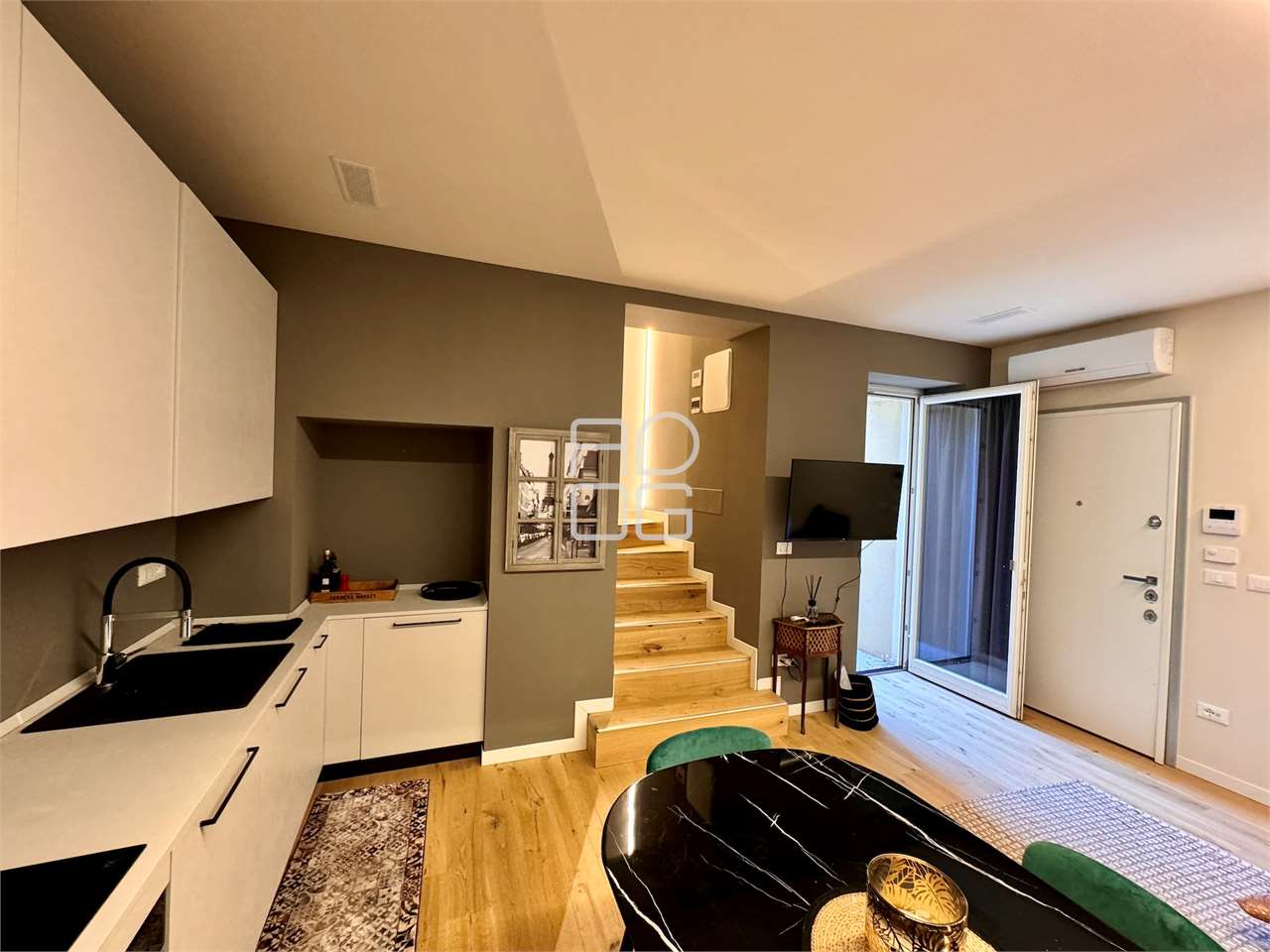 Im Herzen der Altstadt von Desenzano del Garda, mit direktem Zugang vom Hauptplatz und Blick auf einen reizvollen Innenhof, steht eine elegante Wohnung in einem aufwendig renovierten historischen Palazzo zum Verkauf. Die Wohnung befindet sich im ersten Stock und erstreckt sich über zwei Ebenen. Der Eingangsbereich führt in ein helles Wohnzimmer mit Kochbereich und einem charakteristischen kleinen Balkon. Eine bequeme Innentreppe führt in den Schlafbereich, der ein großzügiges Schlafzimmer mit Blick auf den Hof, ein Badezimmer mit Dusche sowie einen praktischen Abstellraum umfasst.