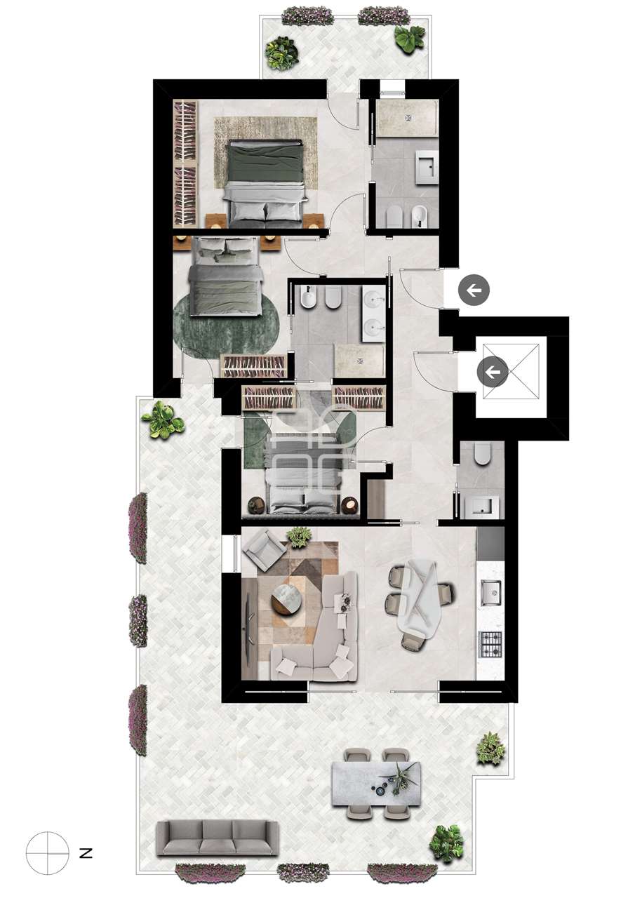 The property consists of a spacious living area with open-plan kitchen, directly overlooking the private terrace; a hallway leading to the sleeping area with direct elevator access; a guest bathroom for the living area; and three bedrooms, including a master bedroom with en-suite bathroom and balcony, while the other two bedrooms share a bathroom. All rooms feature large windows, ensuring excellent natural light and seamless continuity between indoor and outdoor spaces in the living area.