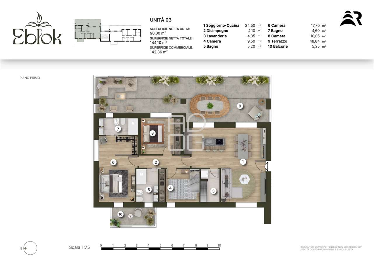Within this prestigious setting, we present Unit 03, a generously sized four-room apartment located on the first floor, distinguished by its spacious living area with open-plan kitchen, characterized by large windows opening onto a spectacular terrace of nearly 50 sqm: a second outdoor living room, perfect for enjoying pleasant moments of relaxation and conviviality. The sleeping area includes a master bedroom with private bathroom, walk-in closet, and access to a balcony, two single bedrooms, an additional bathroom with window, and a convenient technical/laundry room.