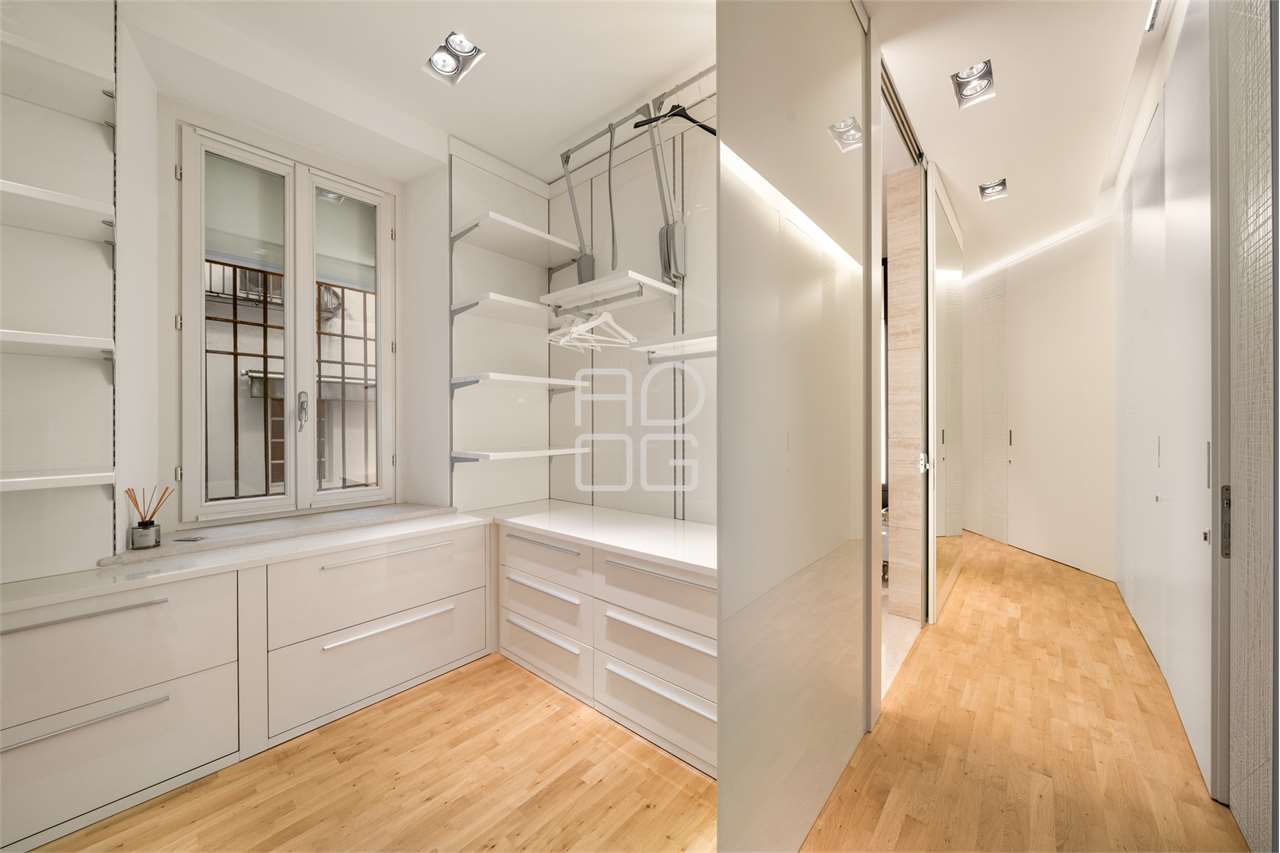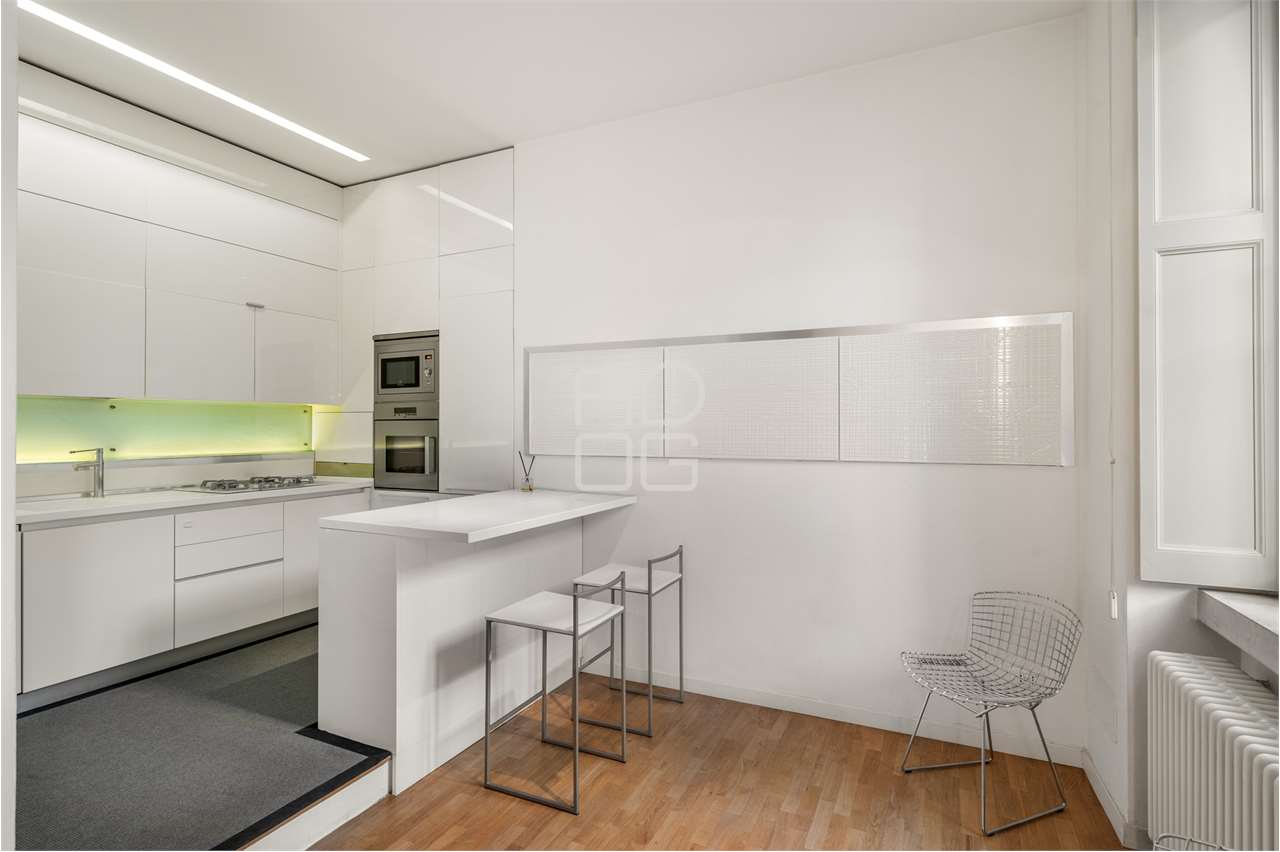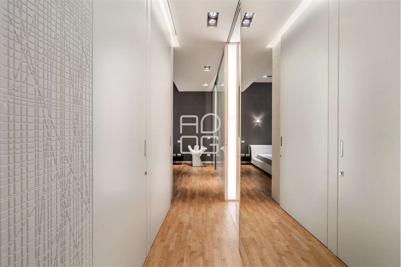 La cucina, separata da una parete scorrevole, è funzionale e ben organizzata, con una zona pranzo illuminata da luce naturale e da un sistema di illuminazione integrato nelle controsoffittature, presenti in tutta l’abitazione.