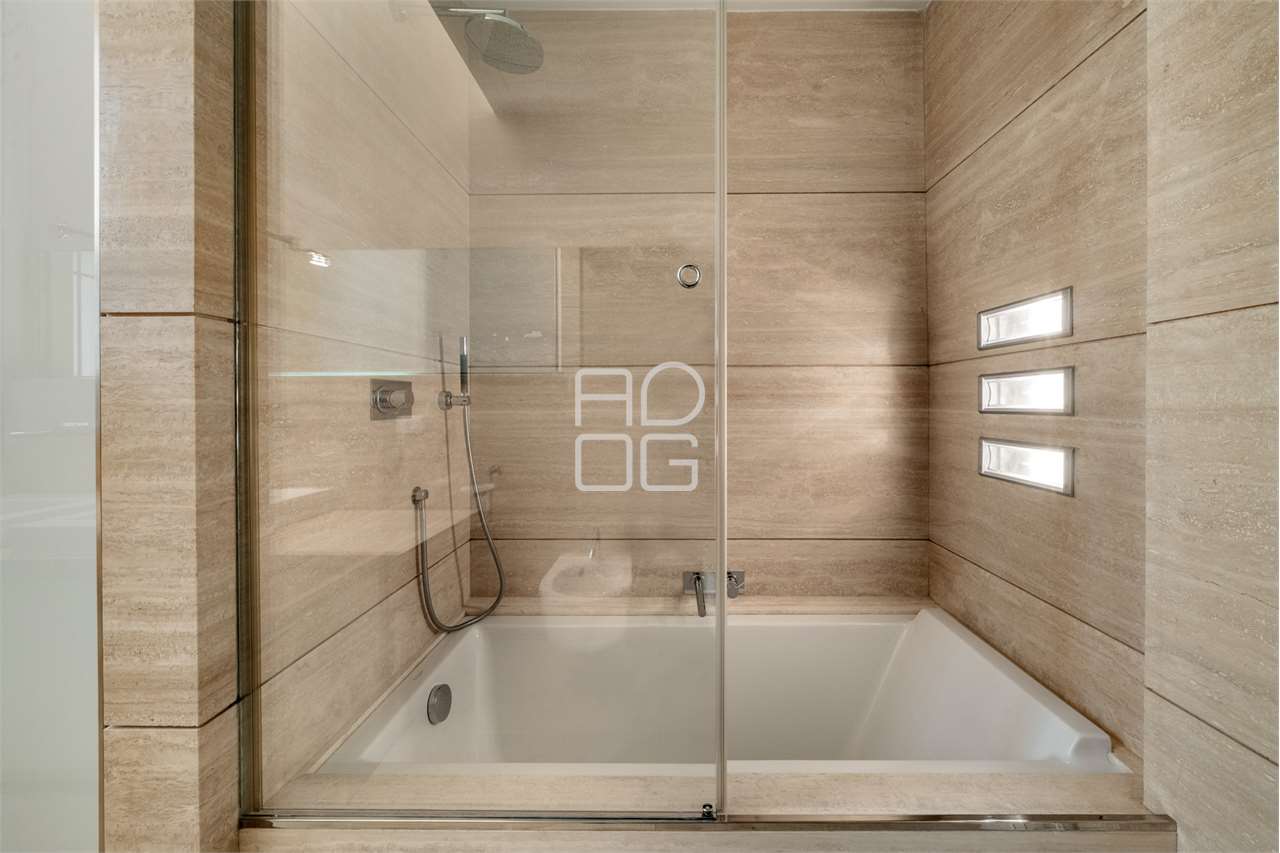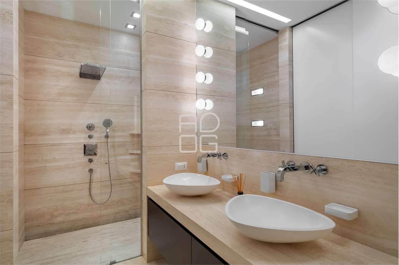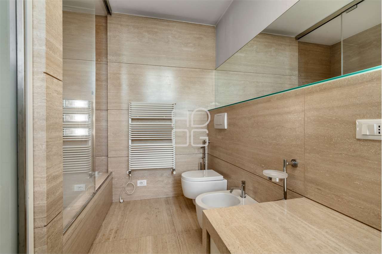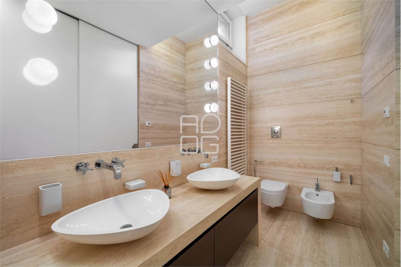 La cucina, separata da una parete scorrevole, è funzionale e ben organizzata, con una zona pranzo illuminata da luce naturale e da un sistema di illuminazione integrato nelle controsoffittature, presenti in tutta l’abitazione.
