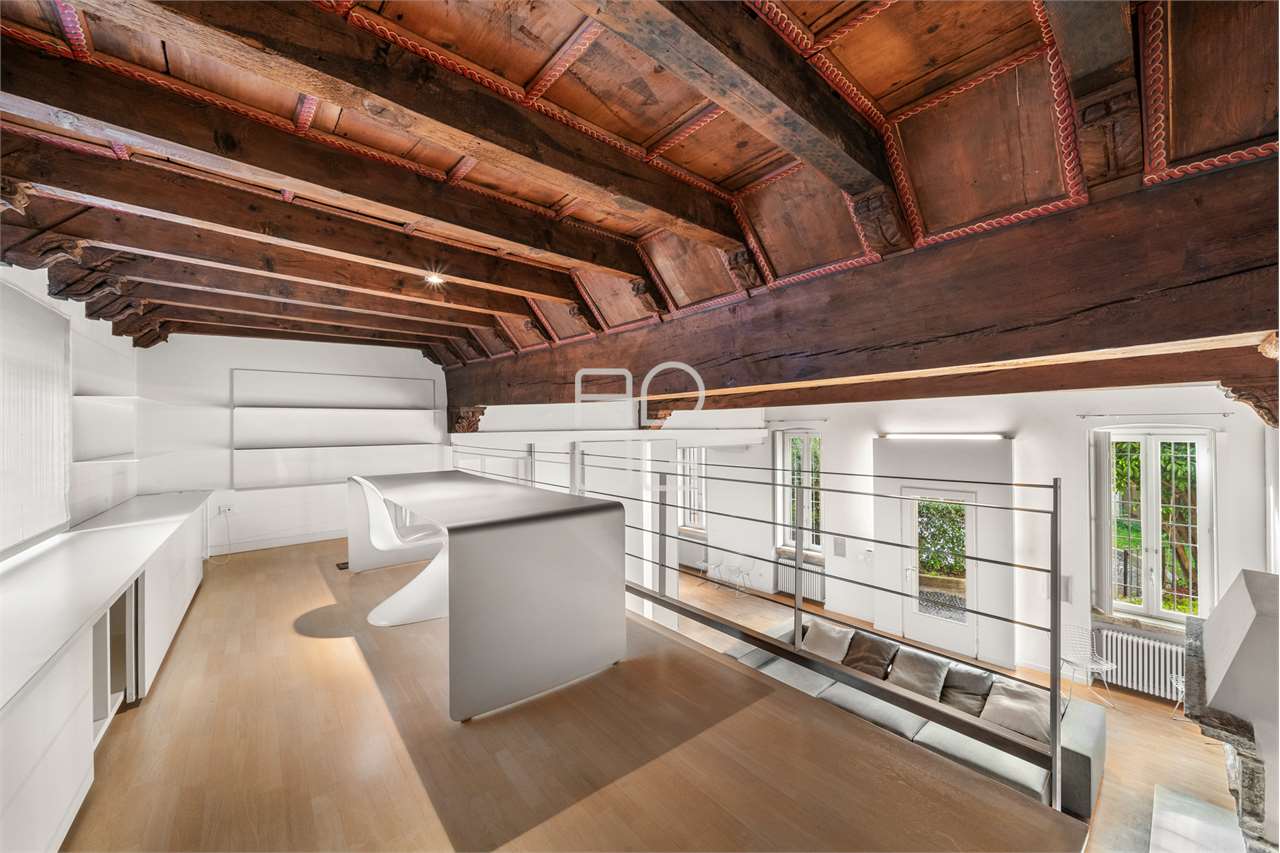 L’ingresso si apre su una zona giorno ampia e luminosa, valorizzata da grandi finestre, travi antiche a vista e da un elegante camino in marmo che racconta la storia della casa. Un pratico soppalco, collegato da una scala dal design moderno, arricchisce ulteriormente l’ambiente.