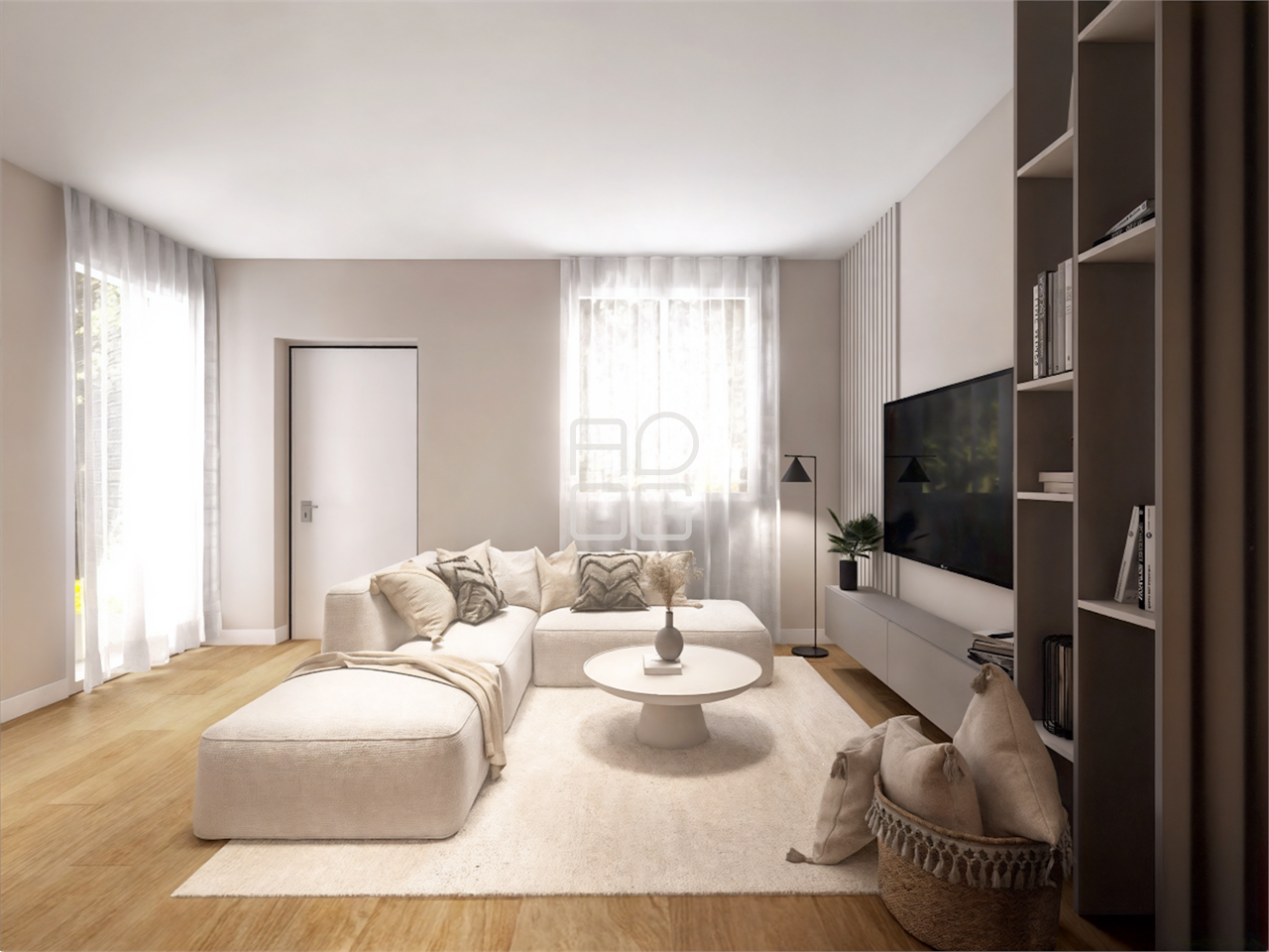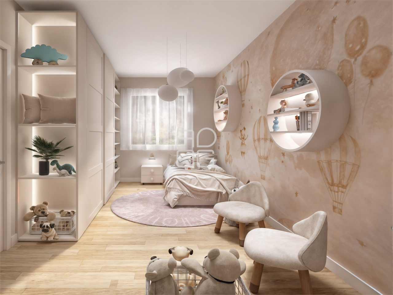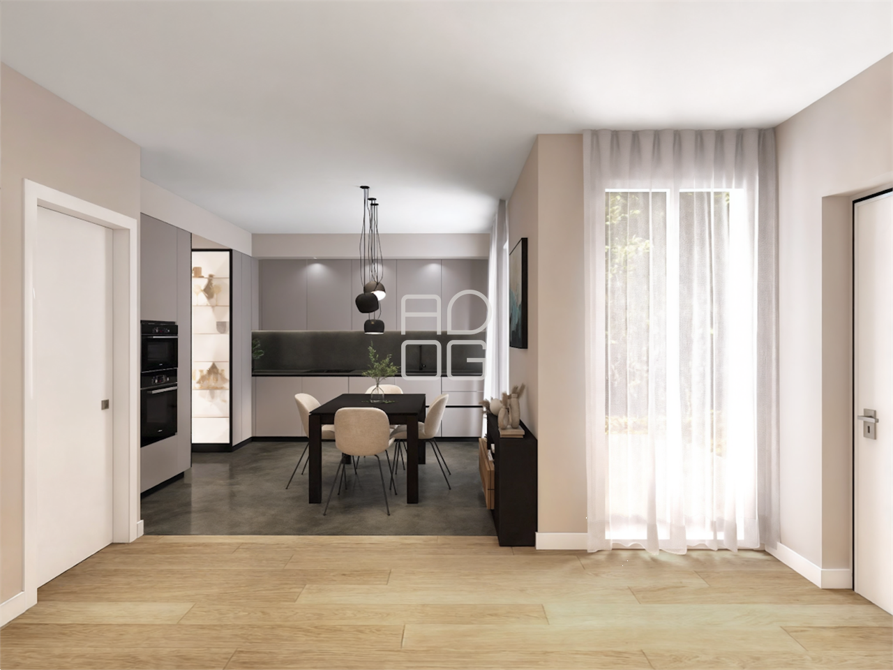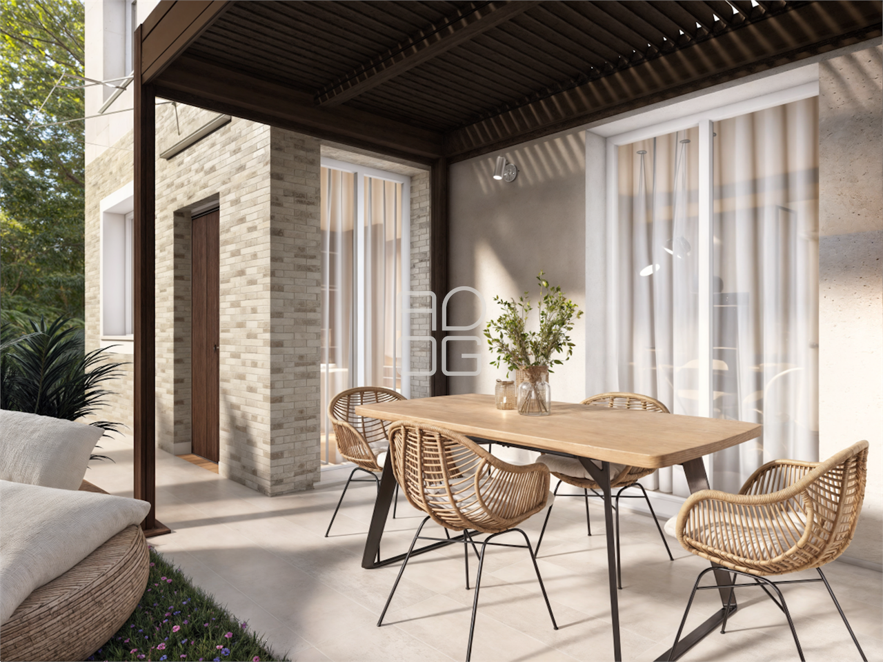 All’interno troviamo una luminosissima zona giorno open-space, con cucina a vista e affaccio diretto sul giardino. La zona notte comprende due camere matrimoniali ampie e due bagni con finiture contemporanee.