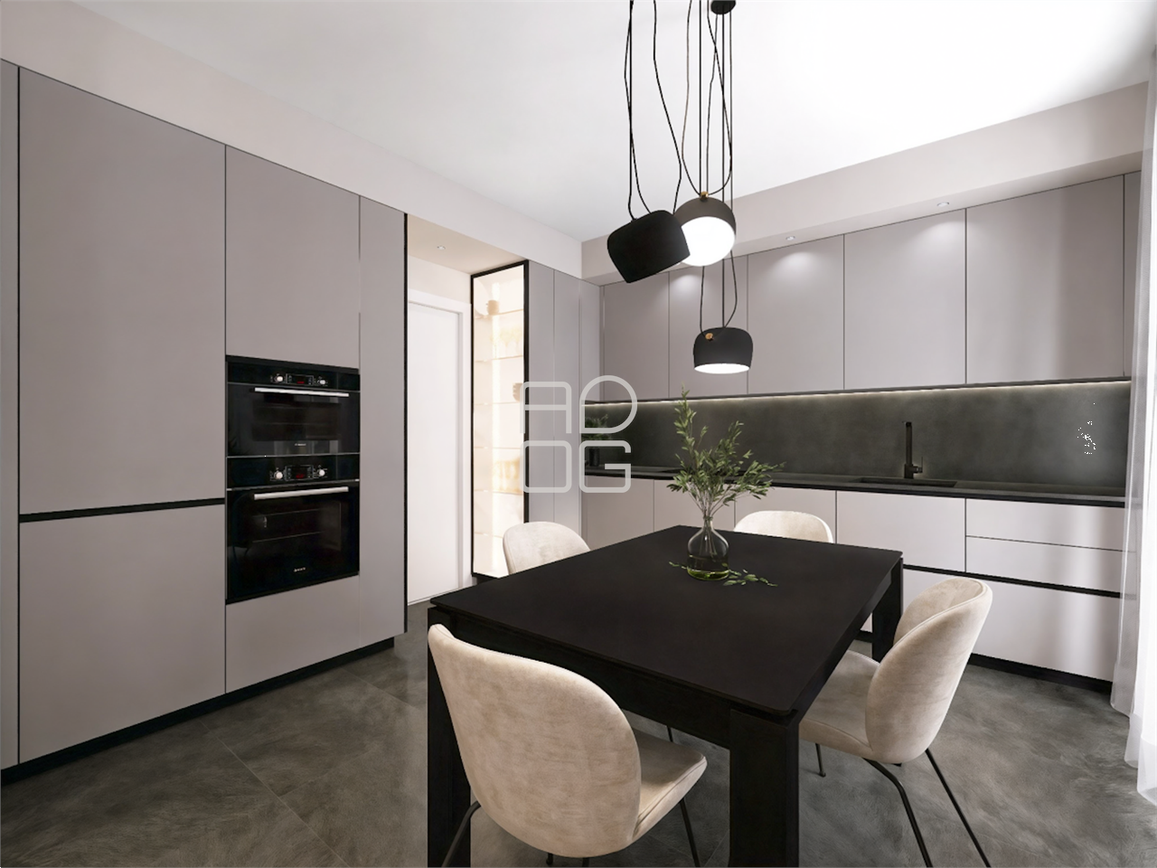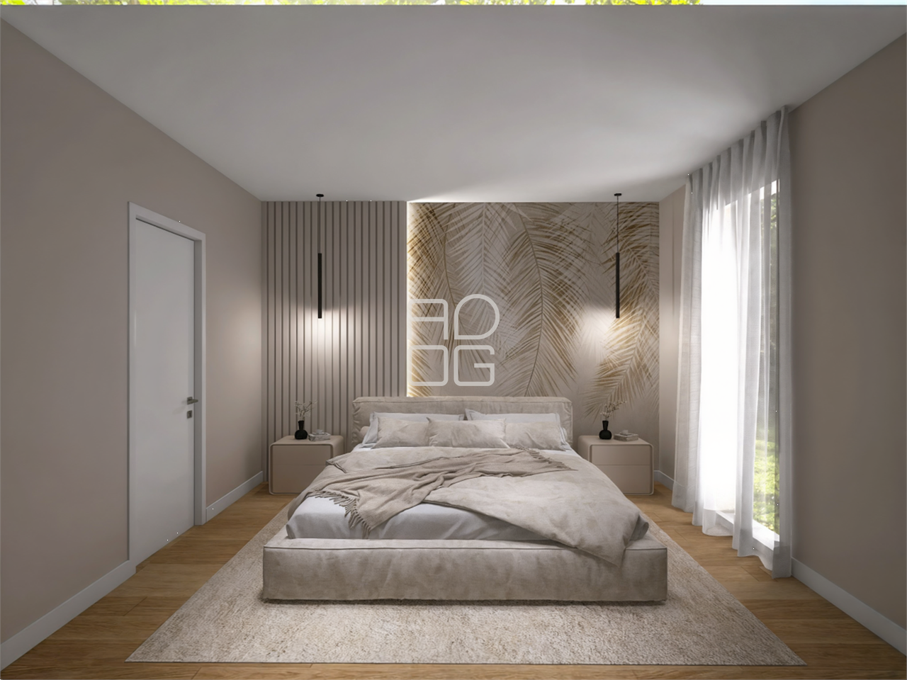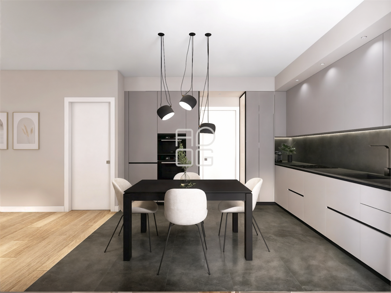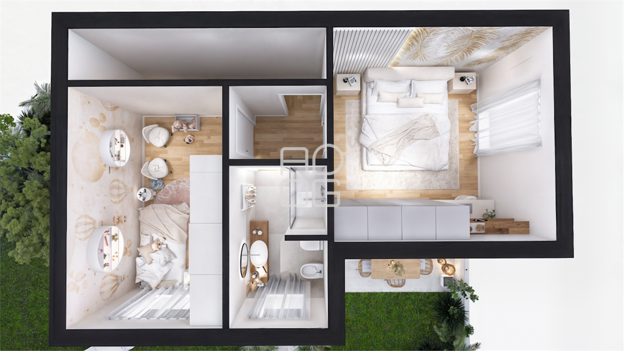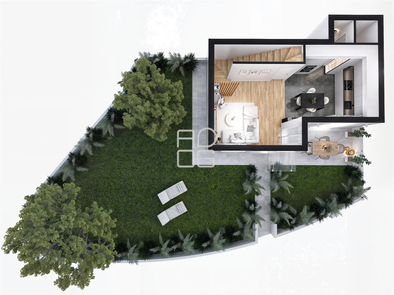 All’interno troviamo una luminosissima zona giorno open-space, con cucina a vista e affaccio diretto sul giardino. La zona notte comprende due camere matrimoniali ampie e due bagni con finiture contemporanee.