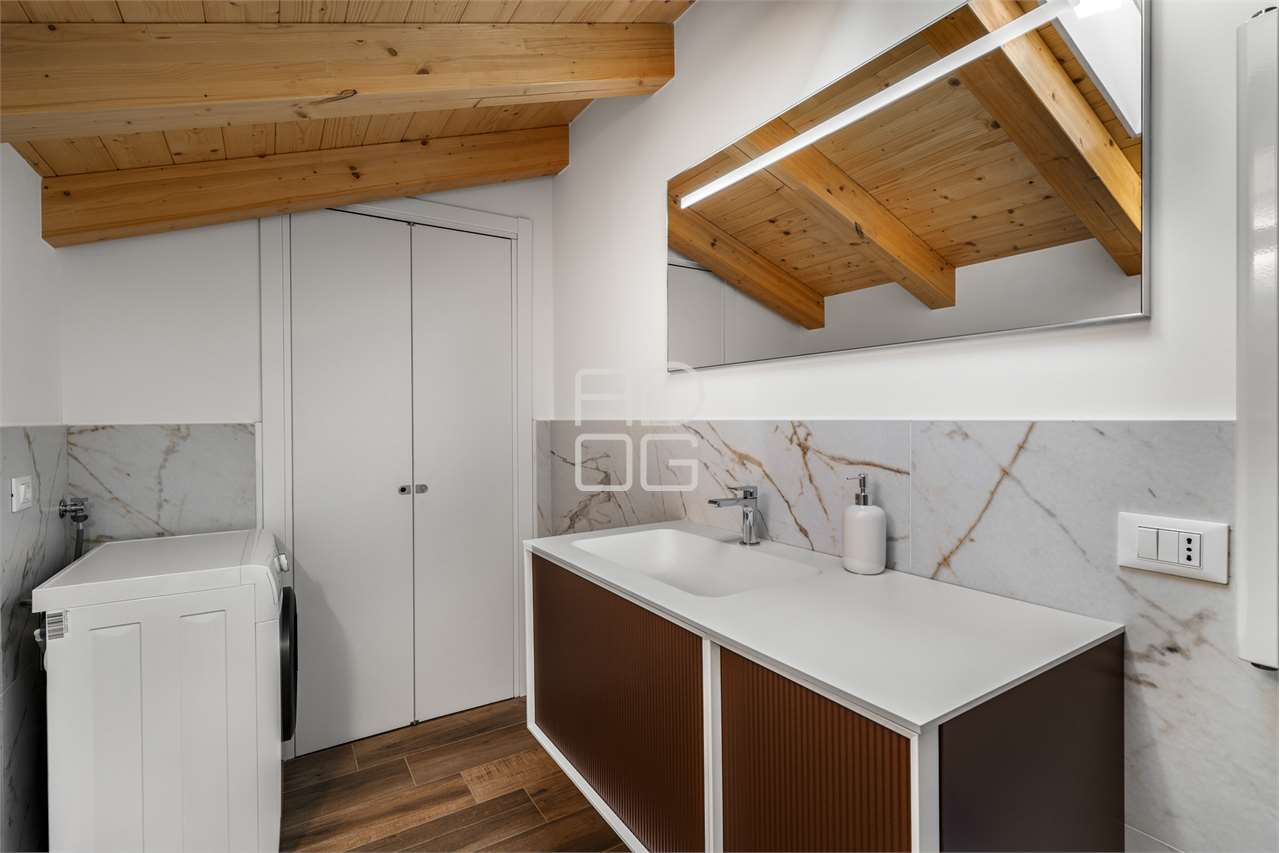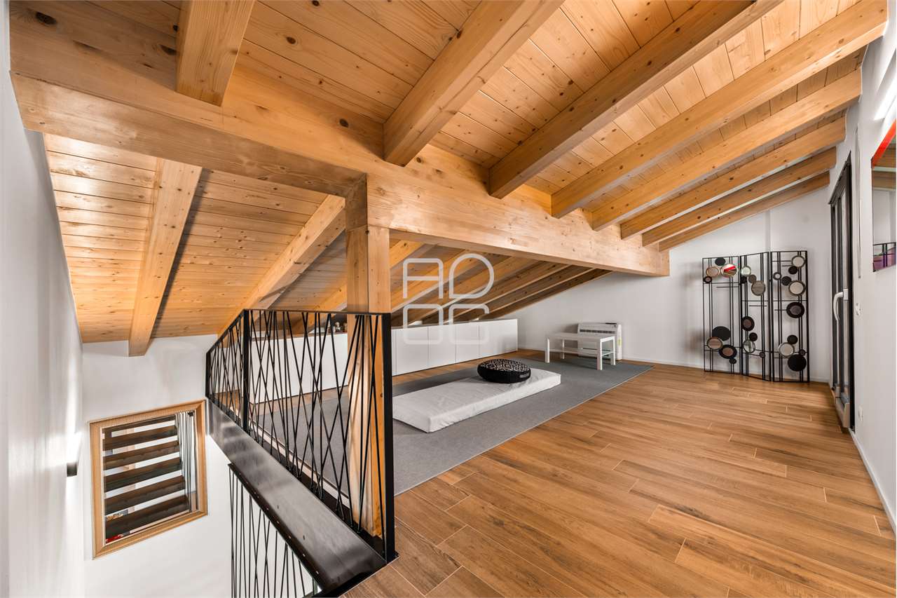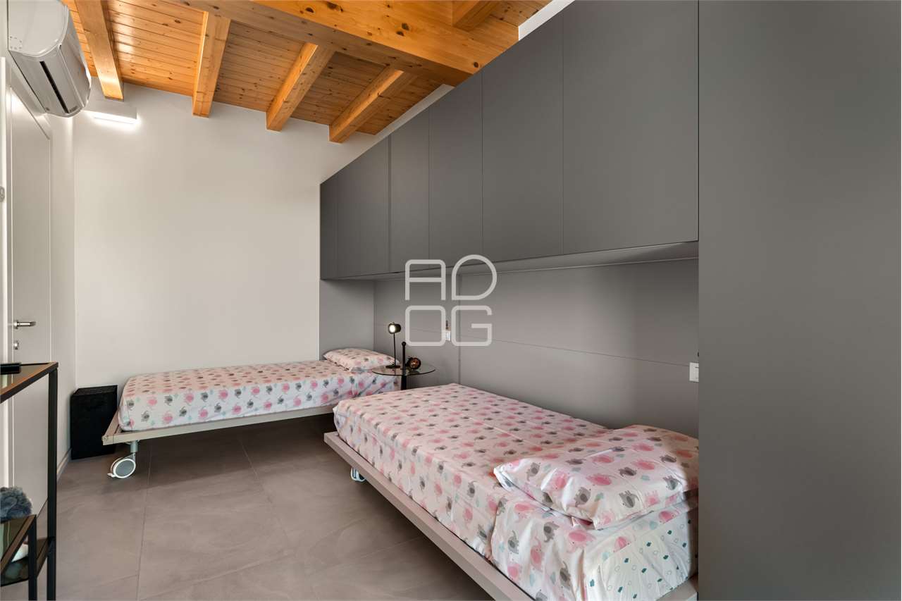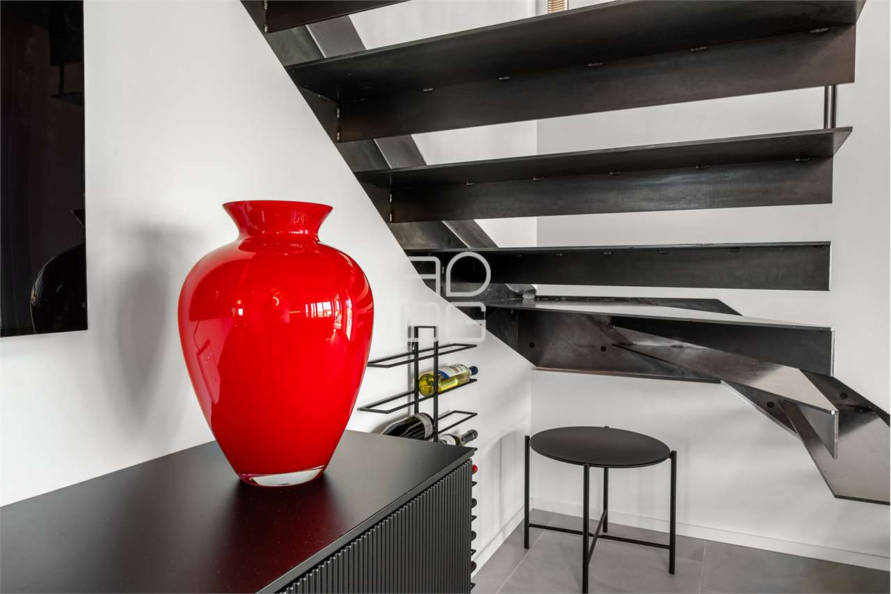 Il vero protagonista del complesso è l’attico al secondo e ultimo piano, un ambiente esclusivo e scenografico impreziosito da terrazze ampie e vivibili che regalano una vista lago davvero impareggiabile, capace di emozionare in ogni momento della giornata. La zona giorno, luminosa e raffinata, è caratterizzata da grandi vetrate che amplificano la luminosità naturale e creano una perfetta continuità tra interno ed esterno. La cucina a vista e la serra bioclimatica contribuiscono a rendere lo spazio accogliente, moderno e perfettamente fruibile.