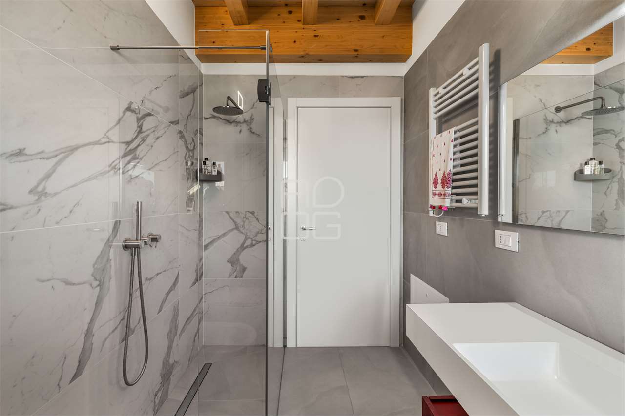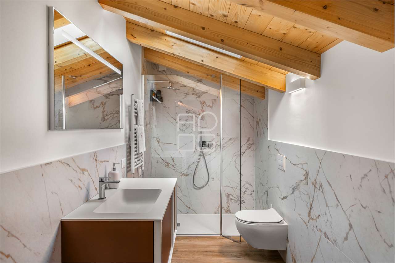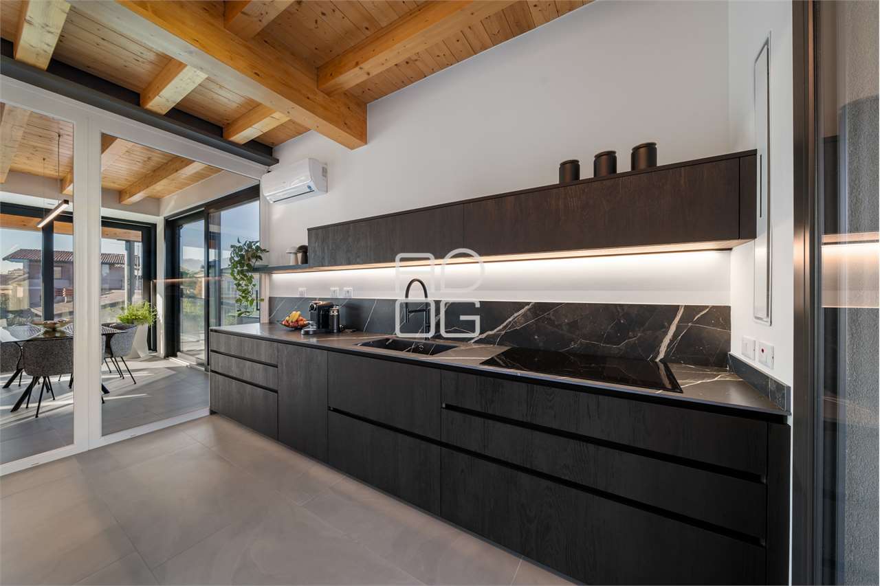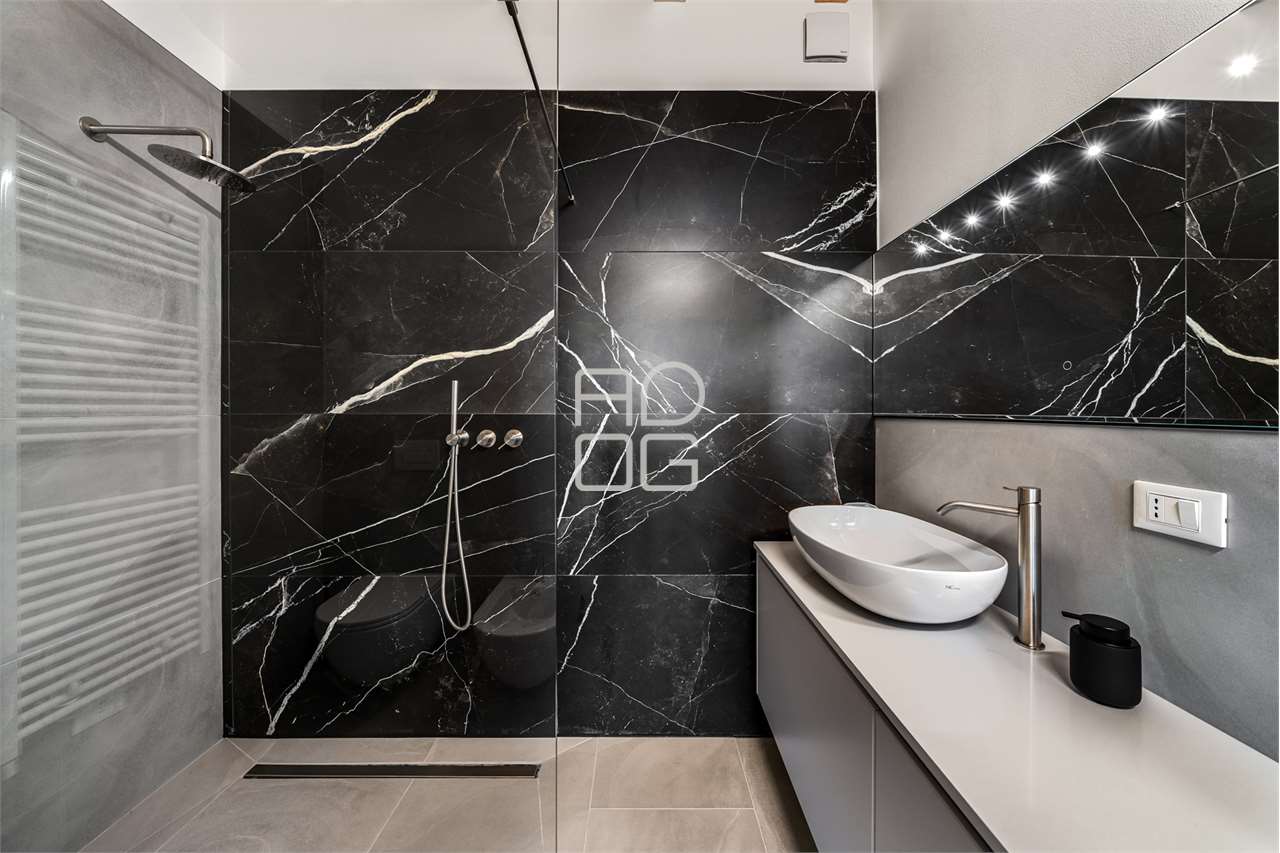 Il vero protagonista del complesso è l’attico al secondo e ultimo piano, un ambiente esclusivo e scenografico impreziosito da terrazze ampie e vivibili che regalano una vista lago davvero impareggiabile, capace di emozionare in ogni momento della giornata. La zona giorno, luminosa e raffinata, è caratterizzata da grandi vetrate che amplificano la luminosità naturale e creano una perfetta continuità tra interno ed esterno. La cucina a vista e la serra bioclimatica contribuiscono a rendere lo spazio accogliente, moderno e perfettamente fruibile.