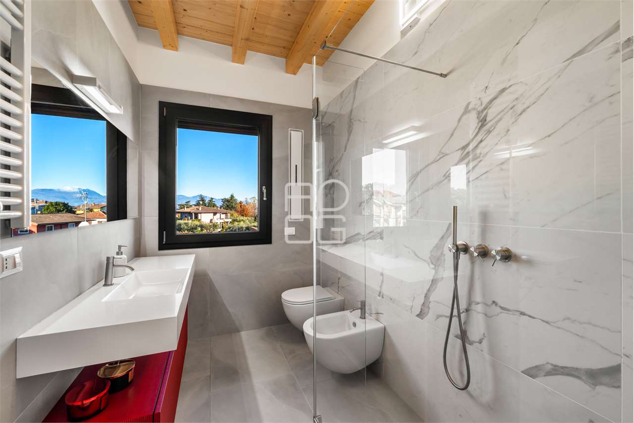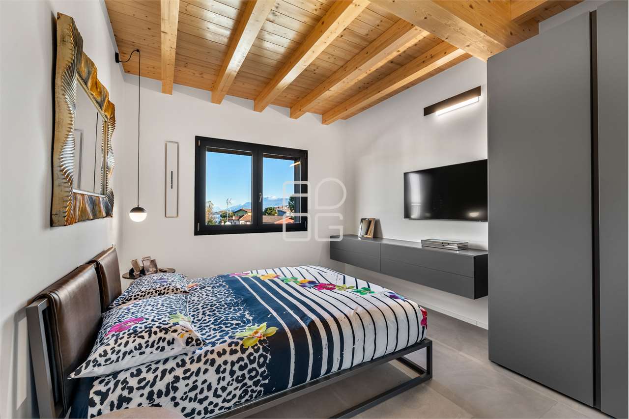 La zona notte offre una camera matrimoniale spaziosa, una seconda camera, due bagni e un ulteriore terrazzo con affaccio panoramico. Una elegante scala interna conduce al piano superiore, dove si sviluppano un’area relax, una terza stanza e un terzo bagno, tutti collegati a una terrazza panoramica che domina il paesaggio circostante, offrendo una vista lago di rara bellezza.
