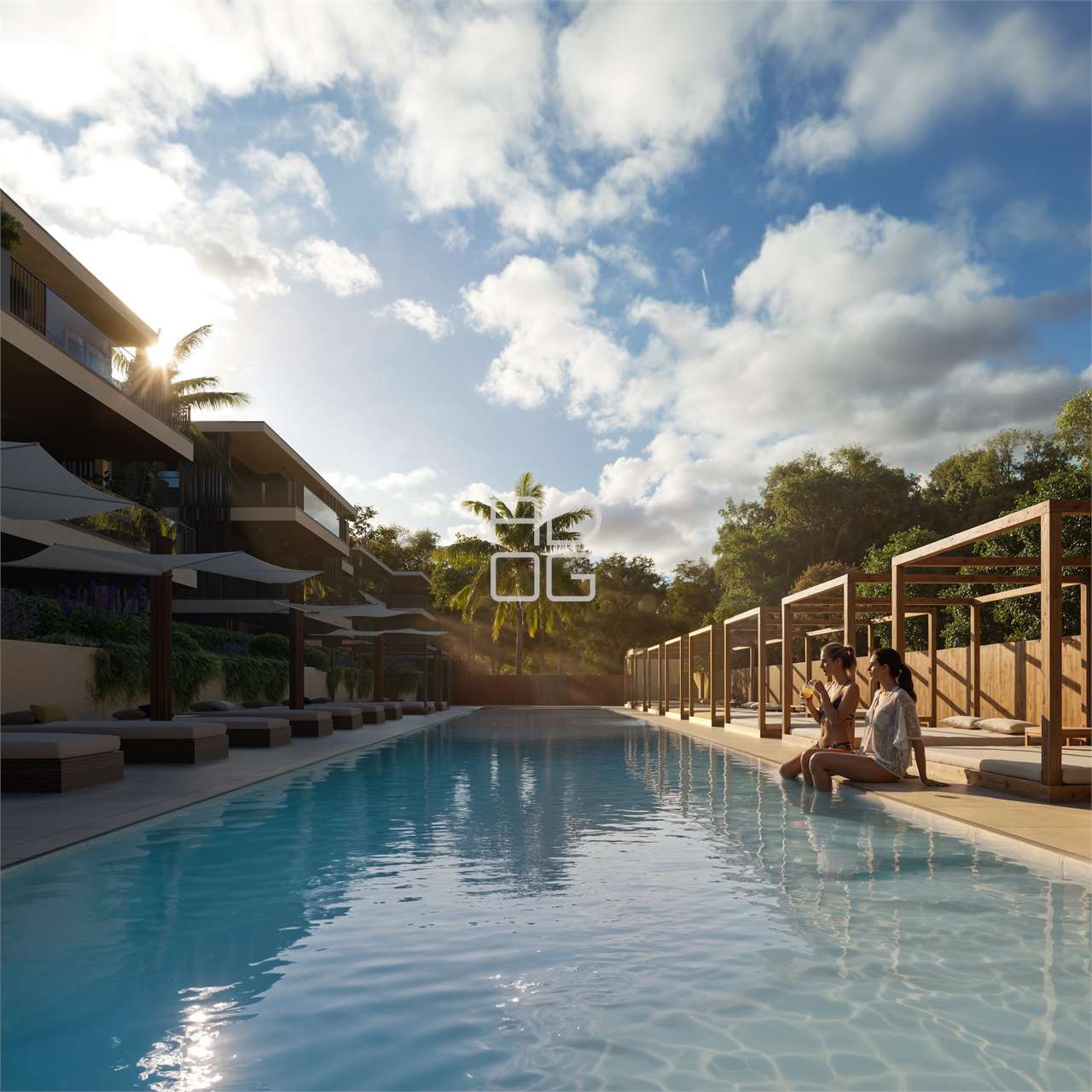 Il complesso offre inoltre una ampia e scenografica piscina con area solarium, spazi comuni curati, autorimesse e posti auto interrati, e posti auto esterni coperti da pergola.