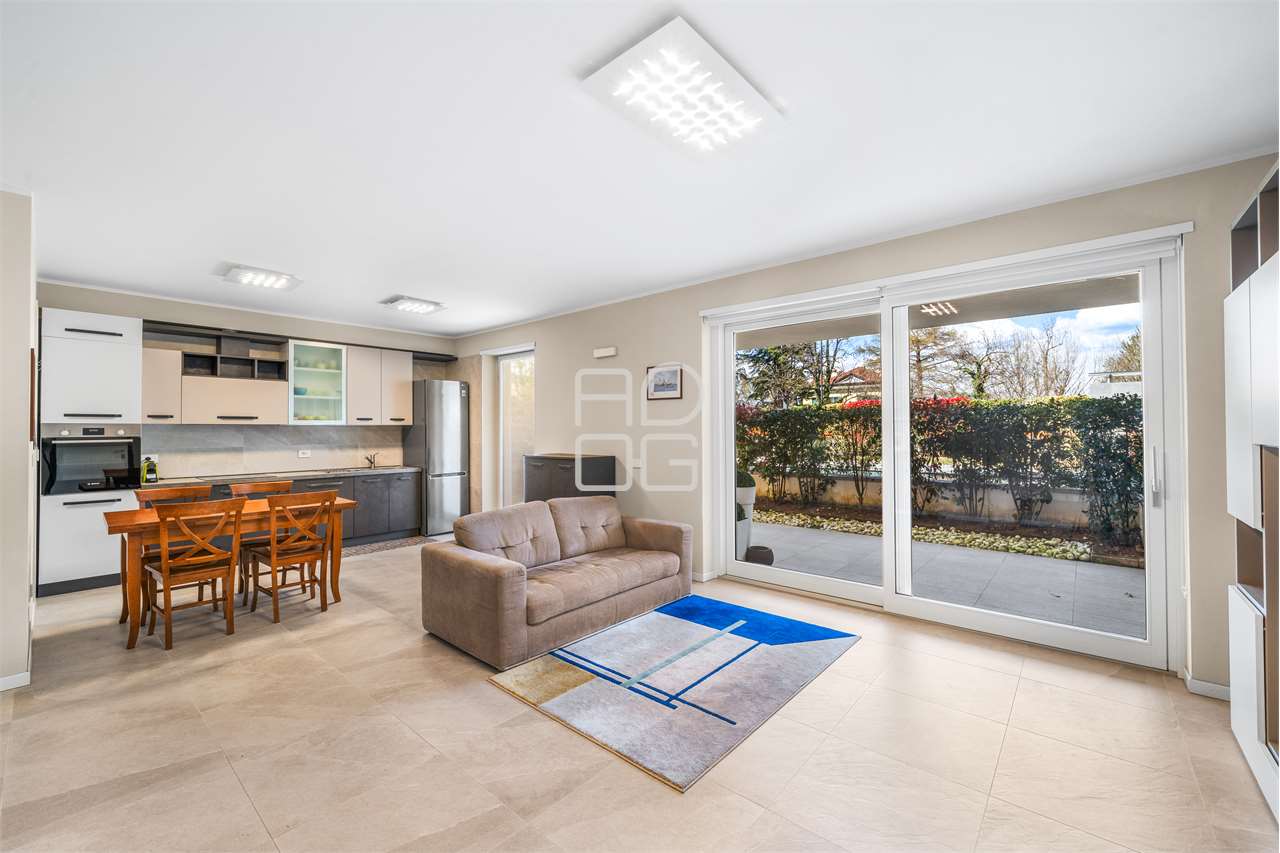 soggiorno con cucina a vista ed accesso diretto attraverso le ampie vetrate al portico e al giardino.