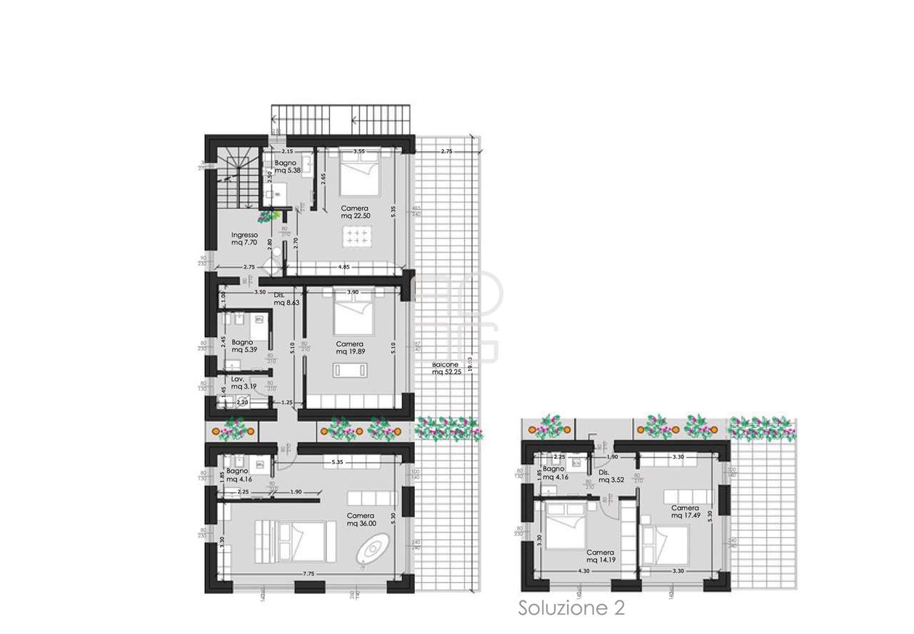 La zona notte, al piano inferiore, è composta da quattro ampie camere da letto, tre bagni, lavanderia e un’ulteriore splendida terrazza privata.