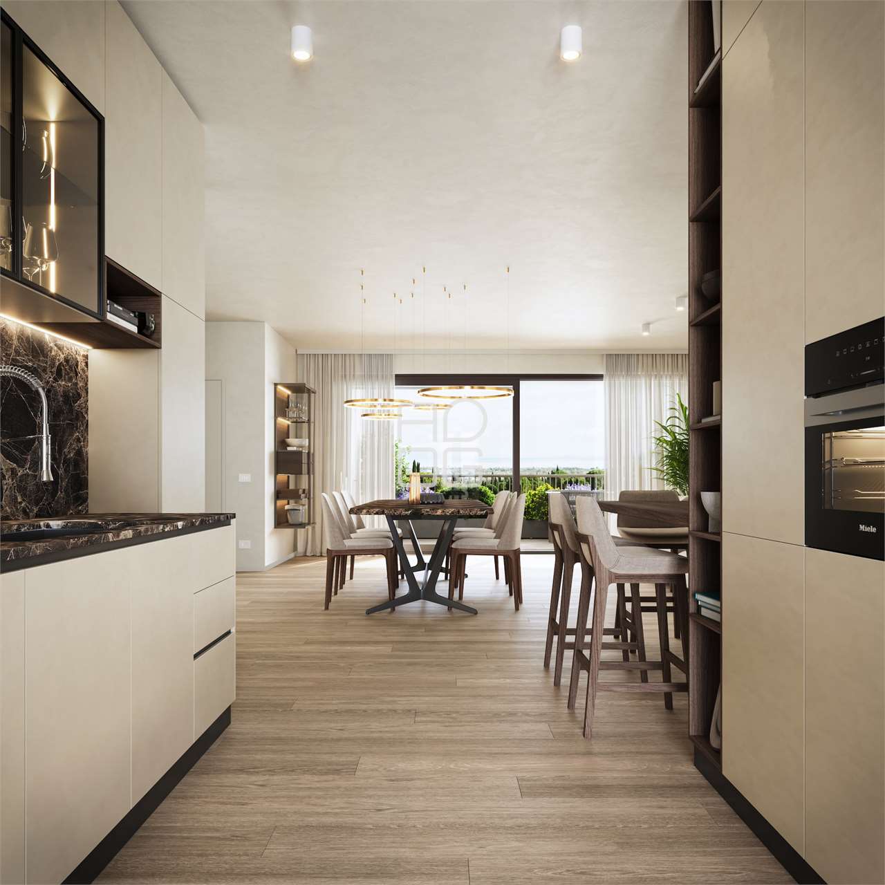 Il progetto prevede appartamenti di grande prestigio, caratterizzati da ampia luminosità, grandi vetrate e generosi spazi interni. Le unità al piano terra dispongono di giardini privati e ampi portici, mentre gli appartamenti al piano primo offrono spaziose terrazze panoramiche. Tutte le abitazioni godono di splendida vista sul Lago di Garda, sulle colline circostanti e sul verde del Garda Golf.