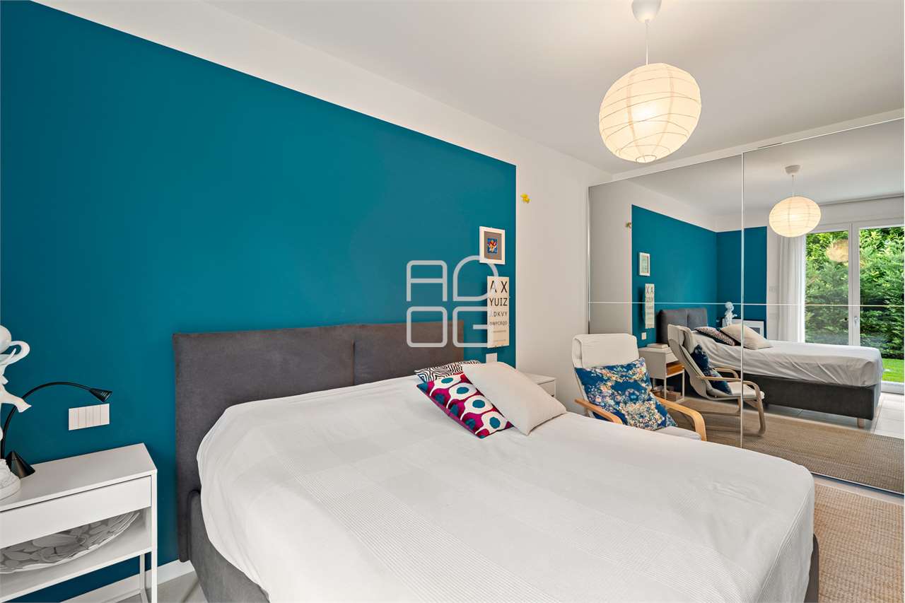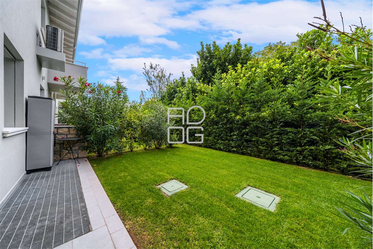 All’interno: accogliente soggiorno con angolo cottura, due bagni moderni con doccia, camera matrimoniale con accesso diretto al giardino e seconda camera ampia e funzionale.